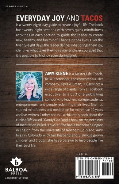 Everyday Joy and Tacos is a twenty-eight-day guide to create a joyful life. The book has twenty-eight sections with seven quick mindfulness activities in each section to guide the reader to create new, healthy, and fun mindful habits in their lives. Over the twenty-eight days, the reader defines what brings them joy, identifies what takes their joy away, and is encouraged that it is possible to find joy even during grief.