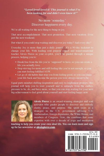 Do you find yourself only living for the weekends? Or waiting to be happy until you get that next big promotion, vacation, or relationship? If you said yes, then this journal is for you. Created by leading soul purpose expert Alexis Pierce to navigate a tough time in her life, this journal will help you stop waiting for later to be happy and start infusing your every day life with joy now. Everyday Joy is more than just a daily journal-it's a 90-day kickstart to change your life. You'll be guided through a unique process, helping you to: Break free from the life you're 'supposed' to have, so you can create a life you actually love. Stop striving for more and still feeling like you're not enough, so you can start feeling fulfilled NOW. Let go of old habits that stop you from feeling good, so you can claim your life back and become the person you were always meant to be. Equal parts mindset-shifting inspiration and easy-to-implement prompts, this journal will help you to trust yourself and to untangle from the endless pressure to be, do, and have more, so that you can stop waiting for your next big achievement to feel good about yourself and start feeling happy now.