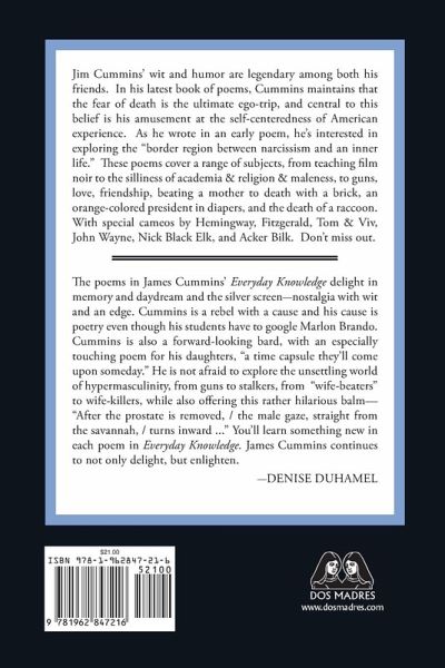 Jim Cummins' wit and humor are legendary among both his friends. In his latest book of poems, Cummins maintains that the fear of death is the ultimate ego-trip, and central to this belief is his amusement at the self-centeredness of American experience. As he wrote in an early poem, he's interested in exploring the "border region between narcissism and an inner life." These poems cover a range of subjects, from teaching film noir to the silliness of academia & religion & maleness, to guns, love, friendship, beating a mother to death with a brick, an orange-colored president in diapers, and the death of a raccoon. With special cameos by Hemingway, Fitzgerald, Tom & Viv, John Wayne, Nick Black Elk, and Acker Bilk. Don't miss out. SAMPLE: Be Careful What You Wish For One night as you're staring into the 'abyss of erudition,' the abyss loses interest in you and moves on down the line- sort of like metaphysical speed dating, except you didn't get the chance to show it your credentials. You're ticked off, but it's unfairness that got you here to begin with, right? One thing you'd been certain of was that you were an interesting case- could this be a wake-up call? The abyss is way down the line now, oblivious, leaving behind a nothingness you peek out over the rim of, like a child who's just learned how to stand up in his crib.