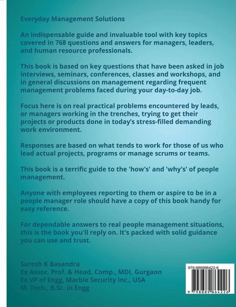An indispensable guide and invaluable tool with key topics covered in 768 questions and answers for managers, leaders, and human resource professionals. Key topics covered include: Management and Leadership, Vision, Mission, and Values, Culture, Empowerment, Effective Delegation, Influencing People, Emotional Intelligence, Effective Communication, Team Building, Conflict Management, Human Resources Management, Recruitment, Hiring, Orientation, and Retention, Coaching, Counseling and Mentoring, Motivation, Managing Up and Across, Managing Managers, Office Politics, Harassment, Performance Management, Discipline and Termination, Management Tools and Templates This book describes the key attributes and practical skills of successful people management that will enhance leadership regardless of your level of experience. Skills and concepts detailed in this book can be easily understood and implemented. They are "everyday" skills, but they are skills and concepts that the best people managers use every day. Each chapter details the concepts, practices, and tools that readers will use to lead their teams efficiently and effectively. This book is a terrific guide to the 'how's' and 'why's' of people management. Responses are based on what tends to work for those of us who lead actual projects, or manage scrums or teams. Anyone with employees reporting to them or aspire to be in a people manager role should have a copy of this book handy for easy reference.