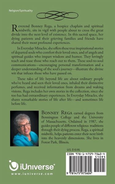 Reverend Bonney Rega, a hospice chaplain and spiritual midwife, sits in vigil with people about to cross the great divide into the next level of existence. In this sacred space, her dying patients and their grieving families and friends have shared their most profound experiences. In Everyday Miracles, she offers these true inspirational stories of departed souls who comfort their loved ones, and of angels and spiritual guides who impart wisdom and humor. They lovingly teach and tease those who reach out to them. These soul-to-soul communications—encouraging personal transformation and a deeper understanding of the soul’s journey—illustrate the divine wit that infuses those who have passed on. These tales of life beyond life are about ordinary people who’ve heard and seen their loved ones, inhaled their distinctive perfumes, and received information from dreams and waking visions. Rega includes her own stories in the collection, since she too has had extraordinary experiences. In Everyday Miracles, she shares remarkable stories of life after life—and sometimes life before life.