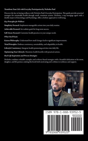 Transform Your Life with Everyday Participation by Nicholos Paul Discover the ultimate guide to sustainable health with Nicholos Paul's Everyday Participation. This book offers practical strategies and insights for achieving lasting wellness through small, consistent actions. Nicholos, a top-performing mortgage agent with a double major in Kinesiology and Psychology, combines his extensive knowledge to provide a holistic approach to health. Key Principles for Lasting Wellness Simplicity Focused: Cut through the noise with essential, manageable actions that fit seamlessly into your daily routine. Achievable Focused: Set realistic goals that foster long-term success, avoiding extreme diets and strenuous workout plans. Self-Aware Focused: Tailor your health practices to your unique needs and preferences for meaningful and effective results. What You'll Gain Kaizen Philosophy: Learn how small, incremental changes can lead to significant improvements. Triad Principles: Embrace consistency, sustainability, and adaptability in your approach to physical activity, nutrition, and mental health. Lifestyle Consistency: Make health-promoting activities a natural part of your daily life. Optimizing Your Lifestyle: Achieve the greatest return on investment in your health through practical, meaningful actions. Real-Life Stories and Proven Strategies Nicholos uses real-life examples and evidence-based strategies to illustrate the power of everyday participation. His personal stories add a relatable touch, motivating you to take control of your health. Inspirational Dedication Dedicated to his mom, daughter, and life partner, Nicholos' book is a testament to resilience, inspiration, and unwavering support, encouraging readers to transform their lives. Join the Movement Everyday Participation is more than a book; it's a movement towards a healthier, more fulfilling life. By embracing Nicholos Paul's principles, you will: Empower yourself to make informed, sustainable health decisions. Simplify your approach to wellness. Achieve realistic goals that lead to lasting success. Cultivate a deeper understanding of your own health needs. Order your copy today and start your journey towards a healthier, more vibrant life. Embrace the principles of Everyday Participation and discover the power of small, consistent actions. Your transformation begins here. Get your copy of Everyday Participation and take the first step towards a healthier, more vibrant life.