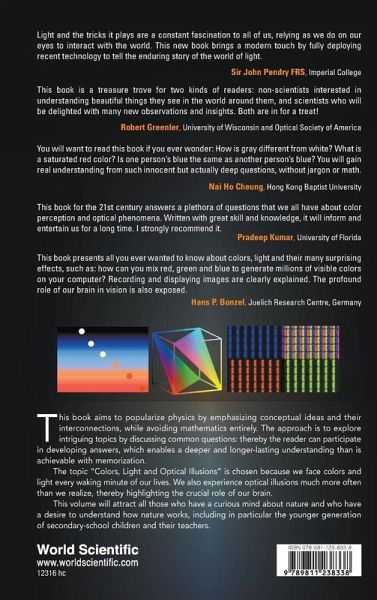 This book aims to popularize physics by emphasizing conceptual ideas of physics and their interconnections, while avoiding mathematics entirely. The approach is to explore intriguing topics by asking and discussing questions, thereby the reader can participate in developing answers, which enables a deeper understanding than is achievable with memorization. The topic of this volume, "Colors, light and Optical Illusions", is chosen because we face colors and light every waking minute of our lives, and we experience optical illusions much more often than we realize. This book will attract all those with a curious mind about nature and with a desire to understand how nature works, especially the younger generation of secondary-school children and their teachers.