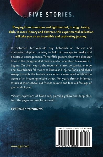 Five stories. Ranging from humorous and lighthearted, to edgy, twisty, dark, to more literary and abstract, this experimental collection will take you on an incredible and captivating journey. A disturbed ten-year-old boy befriends an abused and mistreated elephant, vowing to help him escape to deadly and disastrous consequences. Three fifth graders discover a dinosaur bone in the playground at recess, and an operation to excavate it begins. On their way to the mountain crater by sunrise, one by one, four friends fall victim to illness and injury. Panic and chaos sweep through the tristate area when a mass alert notification warns of an incoming missile threat. Ten years after an infamous attack at their school, old friends reunite and face old feelings of guilt and of grief. Vibrant explosions of blood red, piercing yellow and deep blue, turn the pages and see for yourself... EVERYDAY RAINBOWS