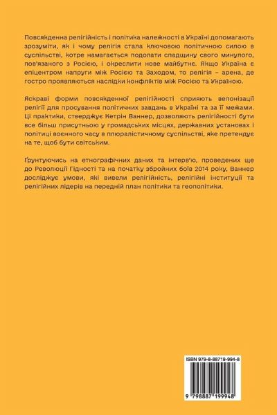 ENG Everyday Religiosity and the Politics of Belonging in Ukraine reveals how and why religion has become a pivotal political force in a society struggling to overcome the legacy of its entangled past with Russia and chart a new future. If Ukraine is "ground zero" in the tensions between Russia and the West, religion is an arena where the consequences of conflicts between Russia and Ukraine keenly play out.Vibrant forms of everyday religiosity pave the way for religion to be weaponized and securitized to advance political agendas in Ukraine and beyond. These practices, Catherine Wanner argues, enable religiosity to be increasingly present in public spaces, public institutions, and wartime politics in a pluralist society that claims to be secular.Based on ethnographic data and interviews conducted since before the Revolution of Dignity and the outbreak of armed combat in 2014, Wanner investigates the conditions that catapulted religiosity, religious institutions, and religious leaders to the forefront of politics and geopolitics.UA Повсякденна релігійність і політика належності в Україні допомагають зрозуміти, як і чому релігія стала ключовою політичною силою в суспільстві, котре намагається подолати спадщину свого минулого, пов'язаного з Росією, і окреслити нове майбутнє. Якщо Україна є епіцентром напруги між Росією т