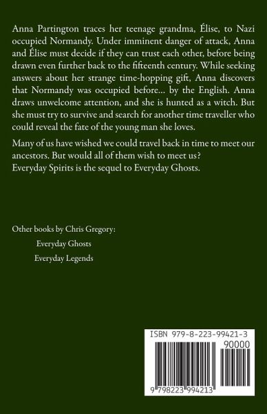 Anna Partington traces her teenage grandma, Élise, to Nazi occupied Normandy. Under imminent danger of attack, Anna and Élise must decide if they can trust each other, before being drawn even further back to the fifteenth century. While seeking answers about her strange time-hopping gift, Anna discovers that Normandy was occupied before... by the English. Anna draws unwelcome attention, and she is hunted as a witch. But she must try to survive and search for another time traveller who could reveal the fate of the young man she loves. Many of us have wished we could travel back in time to meet our ancestors. But would all of them wish to meet us? Everyday Spirits is the sequel to Everyday Ghosts.