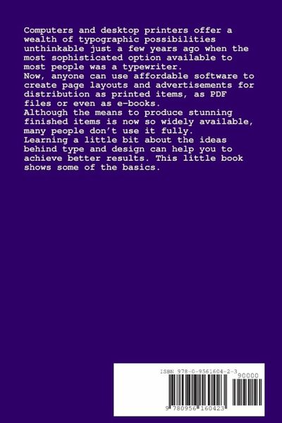 Computers and desktop printers offer a wealth of typographic possibilities unthinkable just a few years ago when the most sophisticated option available to most people was a typewriter. Now, anyone can use affordable software to create page layouts and advertisements for distribution as printed items, as PDF files or even as e-books. Although the means to produce stunning finished items is now so widely available, many people don't use it fully. Learning a little bit about the ideas behind type and design can help you to achieve better results. This little book shows some of the basics.
