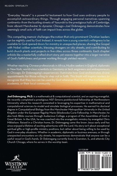 "Everyday Vessels" is a powerful testament to how God uses ordinary people to accomplish extraordinary things. Through engaging personal narratives spanning continents-from the bustling streets of Yaoundé to the prestigious halls of Cambridge, from vibrant Manchester to dynamic Chicago-Joel Dokmegang demonstrates how seemingly small acts of faith can impact lives across the globe. This compelling memoir challenges the notion that only prominent Christian leaders can be mightily used by God. Instead, it reveals how a young scientist's willingness to be available to God opened doors for ministry in unexpected places: sharing the Gospel with Nobel caliber scientists, blessing strangers on city streets, and contributing to bold church plants and projects in five cities across three continents. Each chapter unfolds like a masterfully crafted short story, yet weaves together into a larger narrative of God's faithfulness and power working through yielded vessels. Whether reaching Chinese professionals in Africa, Muslim seekers in England, diplomats in New-York, world-class scientists in Germany or tech engineers and entrepreneurs in Chicago, Dr Dokmegang's experiences illuminate how God orchestrates divine appointments for those willing to step out in faith. This book will inspire readers to recognize that they too can be used by God wherever they are-in the marketplace, academia, or their local community.