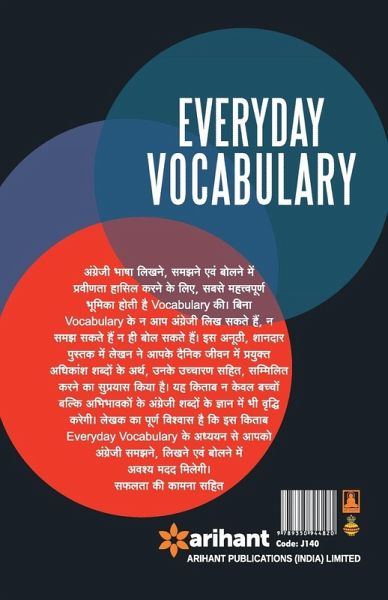 Everyday Vocabulary by Arihant book has been designed with an aim of helping the students improve their vocabulary, as good vocabulary strengthens the writing & speaking skills. The present book contains more than 6100 such words that are used in day-to-day life for conversation. The book provides an easy approach to pronunciation & meanings of frequently used English words. The book covers English Alphabet and Ordinals, Numerals, Words Used in Daily Routine, Name of Parts of the Body, Name of Relations, Name of Ornaments & Jewels, Name of Animals, Name of Birds, Name of Some Reptiles, Water Living Creatures, Worms & Insects, Domestic Articles, Homes & Abodes, Name of Musical Instruments, Name of Minerals, Young Ones of Animals & Birds, Cries of Creatures, Clothes, Dresses, Wearing Apparels, Terms Used in Sports & Games, Names of Directions, Names of Planets in our Solar System, Name of Colors, Name of Medical Sciences & Medicines, Terms Used in Post & Telegraph Department, etc. This book will help in improving your writing & speaking skills.