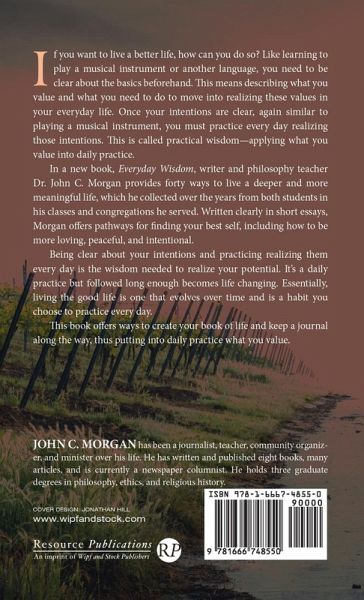If you want to live a better life, how can you do so? Like learning to play a musical instrument or another language, you need to be clear about the basics beforehand. This means describing what you value and what you need to do to move into realizing these values in your everyday life. Once your intentions are clear, again similar to playing a musical instrument, you must practice every day realizing those intentions. This is called practical wisdom--applying what you value into daily practice. In a new book, Everyday Wisdom, writer and philosophy teacher Dr. John C. Morgan provides forty ways to live a deeper and more meaningful life, which he collected over the years from both students in his classes and congregations he served. Written clearly in short essays, Morgan offers pathways for finding your best self, including how to be more loving, peaceful, and intentional. Being clear about your intentions and practicing realizing them every day is the wisdom needed to realize your potential. It's a daily practice but followed long enough becomes life changing. Essentially, living the good life is one that evolves over time and is a habit you choose to practice every day. This book offers ways to create your book of life and keep a journal along the way, thus putting into daily practice what you value.