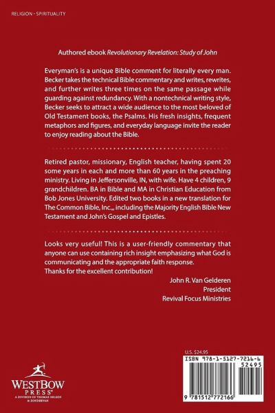 Authored ebook Revolutionary Revelation: Study of John Everyman’s is a unique Bible comment for literally every man. Becker takes the technical Bible commentary and writes, rewrites, and further writes three times on the same passage while guarding against redundancy. With a nontechnical writing style, Becker seeks to attract a wide audience to the most beloved of Old Testament books, the Psalms. His fresh insights, frequent metaphors and figures, and everyday language invite the reader to enjoy reading about the Bible. Retired pastor, missionary, English teacher, having spent 20 some years in each and more than 60 years in the preaching ministry. Living in Jeffersonville, IN, with wife. Have 4 children, 9 grandchildren. BA in Bible and MA in Christian Education from Bob Jones University. Edited two books in a new translation for The Common Bible, Inc.,, including the Majority English Bible New Testament and John’s Gospel and Epistles. Looks very useful! This is a user-friendly commentary that anyone can use containing rich insight emphasizing what God is communicating and the appropriate faith response. Thanks for the excellent contribution! John R. Van Gelderen President Revival Focus Ministries