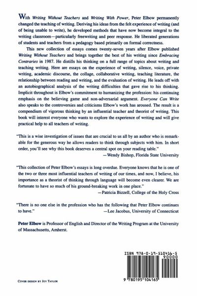 With Writing without Teachers (OUP 1975) and Writing with Power (OUP 1995) Peter Elbow revolutionized the teaching of writing. His process method--and its now commonplace "free writing" techniques--liberated generations of students and teachers from the emphasis on formal principles of grammar that had dominated composition pedagogy. This new collection of essays brings together the best of Elbow's writing since the publication of Embracing Contraries in 1987. The volume includes sections on voice, the experience of writing, teaching, and evaluation. Implicit throughout is Elbow's commitment to humanizing the profession, and his continued emphasis on the importance of binary thinking and nonadversarial argument. The result is a compendium of a master teacher's thought on the relation between good pedagogy and good writing; it is sure to be of interest to all professional teachers of writing, and will be a valuable book for use in composition courses at all levels.