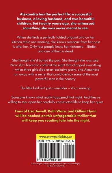 Alexandra has the perfect life: a successful business, a loving husband, and two beautiful children. But twenty years ago, she witnessed something she was never meant to see. When she finds a perfectly folded origami bird on her kitchen table one morning, she knows someone from her past is after her. Only four people knew her nickname - Birdie - and one of them is dead. She thought she'd buried the past. She thought she was safe. Now she's forced to confront the night that changed everything - when three girls died at an exclusive party, and Alexandra ran away with a secret that could destroy some of the most powerful men in the country. The little bird isn't just a reminder - it's a warning. Someone knows what really happened that night. And they're willing to tear apart her carefully constructed life to keep her quiet. Fans of Lisa Jewell, Ruth Ware and Gillian Flynn will be hooked on this unforgettable thriller which will keep you reading late into the night.