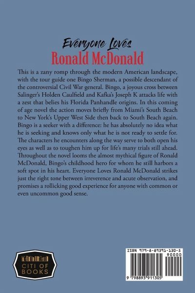 This is a zany romp through the modern American landscape, with the tour guide one Bingo Sherman, a possible descendant of the controversial Civil War general. Bingo, a joyous cross between Salinger's Holden Caulfield and Kaflca's Joseph K attacks life with a zest that belies his Florida Panhandle origins. In this coming of age novel the action moves briefly from Miami's South Beach to New York's Upper West Side then back to South Beach again. Bingo is a seeker with a difference: he has absolutely no idea what he is seeking and knows only what he is not ready to settle for. The characters he encounters along the way serve to both open his eyes as well as to toughen him up for life's many trials still ahead. Throughout the novel looms the almost mythical figure of Ronald McDonald, Bingo's childhood hero for whom he still harbors a soft spot in his heart. Everyone Loves Ronald McDonald strikes just the right tone between irreverence and acute observation, and promises a rollicking good experience for anyone with common or even uncommon good sense.