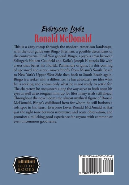 This is a zany romp through the modern American landscape, with the tour guide one Bingo Sherman, a possible descendant of the controversial Civil War general. Bingo, a joyous cross between Salinger's Holden Caulfield and Kaflca's Joseph K attacks life with a zest that belies his Florida Panhandle origins. In this coming of age novel the action moves briefly from Miami's South Beach to New York's Upper West Side then back to South Beach again. Bingo is a seeker with a difference: he has absolutely no idea what he is seeking and knows only what he is not ready to settle for. The characters he encounters along the way serve to both open his eyes as well as to toughen him up for life's many trials still ahead. Throughout the novel looms the almost mythical figure of Ronald McDonald, Bingo's childhood hero for whom he still harbors a soft spot in his heart. Everyone Loves Ronald McDonald strikes just the right tone between irreverence and acute observation, and promises a rollicking good experience for anyone with common or even uncommon good sense.