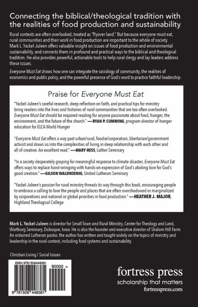 Rural contexts are often over-looked, treated as "flyover land." But because everyone must eat, rural communities and their work in food production are important to the whole of society. Mark Yackel-Juleen spent many years in rural ministry and is the founder and executive director of Shalom Hill Farm. He offers valuable insight on the present issues of food production and environmental sustainability, and connects it in profound and practical ways to the biblical and theological tradition. The result is a clear set of powerful and actionable tools to help rural leaders and ministers address issues of sustainability and land use in their ministry. Everyone Must Eat masterfully shows how one can integrate the sociology of community, the secular realities of economics and public policy, and the powerful presence of God's word in order to practice faithful leadership.