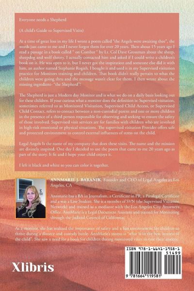 Everyone needs a Shepherd (A child's Guide to Supervised Visits) At a time of great loss in my life I wrote a poem called "the Angels were awaiting thee", the words just came to me and I never forgot them for over 20 years. Then about 15 years ago I read a passage in a book called " on Combat " by Lt. Col Dave Grossman about the sheep, sheepdog and wolf theory. I actually contacted him and asked if I could write a children's book on it. He was open to it, but I never got the inspiration and someone else did it with him, an author named, Stephanie Rogish. I bought it and used it in my Supervised visitation practice for Monitors training and children. That book didn't really pertain to what the children were going thru and the message wasn't clear for them. I then wrote about the missing ingredient- "the Shepherd"! The Shepherd is just a Modern day Monitor and is what we do on a daily basis looking out for these children. If your curious what a monitor does the definition is: Supervised visitation, sometimes referred to as Monitored Visitation, Supervised Child Access, or Supervised Child Contact, refers to contact between a non-custodial parent and one or more children in the presence of a third person responsible for observing and seeking to ensure the safety of those involved. Supervised visit services are for families with children who are involved in high-risk emotional or physical situations. The supervised visitation Provider offers safe and protected environment to control external influences of stress on the child. Legal Angels Is the name of my company that does these visits. The name and the mission are divinely inspired. One day I decided to use the poem that came to me 20 years ago as part of the story. It fit and I hope your child enjoys it. I left it black and white so you can color it together.