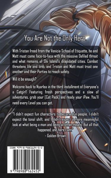 You are not the only hero. With Tristan freed from the Venicia School of Etiquette, he and Matt must come face-to-face with the massive Defiled threat and what remains of Shi Island's dilapidated cities. Combat with the terrifying beasts threatens life and limb, and Tristan and Matt must trust one another and their Parties to reach safety. Will it be enough? Welcome back to Nyarlea in the third installment of Everyone's a Catgirl! Featuring fresh perspectives and a slew of adventures, grab your [Cat Pack] and ready your iPaw. You'll need every Level you can get. Please note: This book is intended for mature audiences only. It contains graphic scenes that are not suitable for younger readers. Parental discretion is advised.