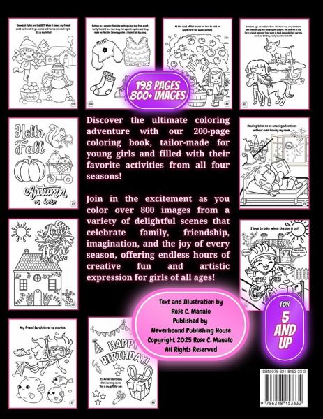 Discover the ultimate coloring adventure with our 200-page coloring book, tailor-made for young girls and filled with their favorite activities from all four seasons! Join in the excitement as you color girls playing in colorful spring gardens, splashing in summer pools, jumping in autumn leaves, and building snowmen in winter wonderlands. Spark your creativity and immerse yourself in a world of vibrant colors as you bring each illustration to life, capturing in your own unique way everything you love with your family, friends and the magic of every season. With a variety of delightful scenes, this book is a celebration of home, friendship, imagination, and the joy of every season, offering endless hours of creative fun and artistic expression for girls of all ages! Each page is designed to inspire and encourage young artists to experiment with colors and techniques, fostering a sense of accomplishment and pride in their creations. From intricate patterns to simple, charming images, this coloring book offers a diverse range of challenges suitable for different skill levels. As you flip through the pages, you'll find enchanting scenes that capture the essence of each season: the vibrant blooms of spring, the sun-soaked adventures of summer, the warm hues of fall, and the cozy, snowy landscapes of winter. Each illustration invites you to explore your imagination, adding your personal flair to every detail. Whether you're coloring alone or sharing the experience with friends and family, this book is the perfect companion for rainy afternoons, lazy weekends, or creative playdates. It's more than just a coloring book; it's a journey through the wonders of the year, filled with laughter, creativity, and endless possibilities. So grab your favorite coloring tools, settle into a cozy spot, and let the adventure begin!