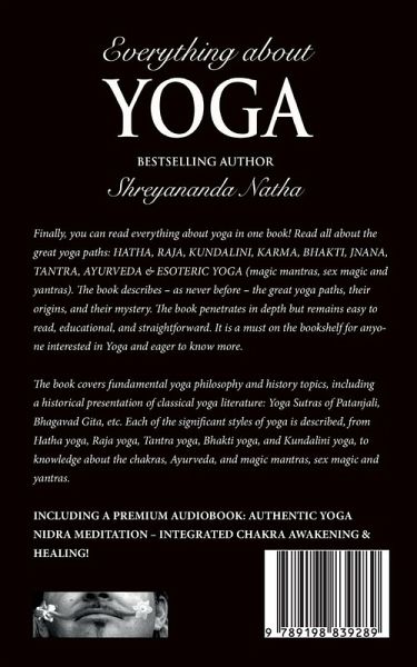 NEW EDITION INCLUDING A PREMIUM AUDIOBOOK! Finally, you can read everything about yoga in one book! Everything About Yoga is the most comprehensive book about yoga, with over 350 pages that are both easy to read and educational. It is an absolute must for future yoga teachers and yoga enthusiasts. Read all about the great yoga paths: HATHA, RAJA, KUNDALINI, KARMA, BHAKTI, JNANA, TANTRA, AYURVEDA & ESOTERIC YOGA (magic mantras, sex magic and yantras). The book describes - as never before - the great yoga paths, their origins, and their mystery. The book penetrates in depth but remains easy to read, educational, and straightforward. It is a must on the bookshelf for anyone interested in Yoga and eager to know more. The book covers fundamental yoga philosophy and history topics, including a historical presentation of classical yoga literature: Yoga Sutras of Patanjali, Bhagavad Gita, etc. Each of the significant styles of yoga is described, from Hatha yoga, Raja yoga, Tantra yoga, Bhakti yoga, and Kundalini yoga, to knowledge about the chakras, Ayurveda, and magic mantras, sex magic and yantras. INCLUDING A PREMIUM AUDIOBOOK: AUTHENTIC YOGA NIDRA MEDITATION - INTEGRATED CHAKRA AWAKENING & HEALING! Kickstart your spiritual awakening! Wonderful yogic deep relaxation and meditation with unique integrated chakra awakening and healing. Yoga Nidra, or yogic sleep, is a unique meditation process that`s powerfully profound and healing for body, mind, and spirit. Practitioners are led into a state of deep relaxation and the experience of our chakra system. Yoga Nidra offers extensive benefits, yet it is one of the most straightforward yoga practices. All you have to do is put on your most comfortable clothes, find a quiet space, lie down on your back, and play the meditation. - Download the audiobook at the back of the book! ¿¿¿THE AUTHOR Shreyananda Natha is the author of popular and best-selling yoga books. He has written one of the most comprehensive books about yoga - EVERYTHING ABOUT YOGA and the study book - TEACHING YOGA AND MEDITATION BEYOND THE POSES. ¿¿MY NAME AND MY MISSION "Shreyananda Natha was the name I was given when I was initiated into the Natha Order and received the master mantra - the Shodasi mantra, after studying yoga and tantra for over twelve years, the highest mantra in yoga and tantra. It means "he who knows". After practicing yoga and meditation continuously for over twenty years, having a yoga school for many years, and leading studies for yoga teachers, I wanted to get out more widely with yoga into our whole society, out of the small yoga room. Spread the knowledge of yoga, our chakra system, and Kundalini Shakti to anyone who will listen. What needed to be added were educational fact books on yoga that didn't just skim the surface or deal with the author's private life. So it became my Sankalpa, my magical wish, and my mission to create exciting yoga books that everyone should be able to read and enjoy. To show how we can apply and use yoga in different areas of life and achieve success and health. Here and now. If you like my books, feel free to follow me on my social media, share and like, tell your friends about the books, and write an honest review; one or two lines don't matter. All support is precious. Thanks!"