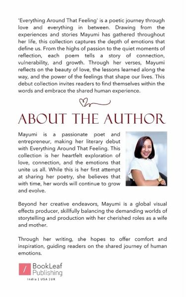 'Everything Around That Feeling' is a poetic journey through love and everything in between. Drawing from the experiences and stories Mayumi has gathered throughout her life, this collection captures the depth of emotions that define us. From the highs of passion to the quiet moments of reflection, each poem tells a story of connection, vulnerability, and growth. Through her verses, Mayumi reflects on the beauty of love, the lessons learned along the way, and the power of the feelings that shape our lives. This debut collection invites readers to find themselves within the words and embrace the shared human experience.