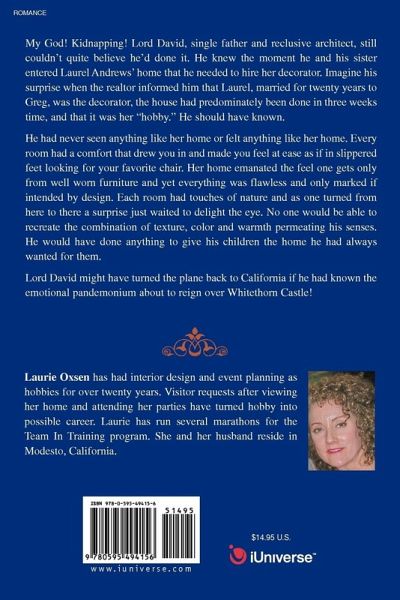 My God! Kidnapping! Lord David, single father and reclusive architect, still couldn't quite believe he'd done it. He knew the moment he and his sister entered Laurel Andrews' home that he needed to hire her decorator. Imagine his surprise when the realtor informed him that Laurel, married for twenty years to Greg, was the decorator, the house had predominately been done in three weeks time, and that it was her "hobby." He should have known. He had never seen anything like her home or felt anything like her home. Every room had a comfort that drew you in and made you feel at ease as if in slippered feet looking for your favorite chair. Her home emanated the feel one gets only from well worn furniture and yet everything was flawless and only marked if intended by design. Each room had touches of nature and as one turned from here to there a surprise just waited to delight the eye. No one would be able to recreate the combination of texture, color and warmth permeating his senses. He would have done anything to give his children the home he had always wanted for them. Lord David might have turned the plane back to California if he had known the emotional pandemonium about to reign over Whitethorn Castle!