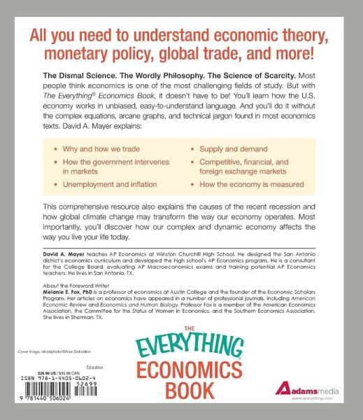 The Dismal Science. The Worldly Philosophy. The Science of Scarcity. Most people think economics is one of the most challenging and complex fields of study. But with this book, it doesn't have to be! You will learn how the U.S. economy works in unbiased, easy-to-understand language. And you can learn it without the complex equations, arcane graphs, and technical jargon you'll find in most economic texts. David A. Mayer and Melanie E. Fox explain: * Why and how we trade * How the government intervenes in markets * Unemployment and inflation * Supply and demand * Competitive, financial, and foreign exchange markets * How the economy is measured You will also learn about the causes and fallout of the recent recession and how global climate change may transform the way our economy operates. Most important, with this introduction, you'll learn how our complex and dynamic economy affects the way we actually live our lives.