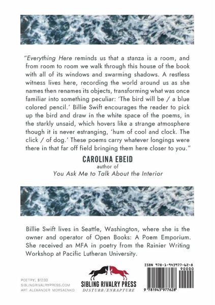 Billie Swift's Everything Here meditates on the mythologies of the banal with a calibrated ambivalence. The "here" of Swift's poems rebuffs and bolsters the eye's ability to document, the body's ability to believe the swelter of its sensate world: "Compare this to flight. / The flight will be my hand / pushing through the dark, / the feel of nothing / against my palm." The speakers "hold [their] mutual / eternities, [their] shared bits of air," unafraid to point toward your favorite star and proclaim it less than alive. Swift's poems share a fabulous muzzle, parsing one hundred tabletops, one hundred jays, one hundred trees, in sharp, precise language. Everything Here is a lissome spell for an othered quotidian, each poem a way to "stay / still, wanting to be that important."