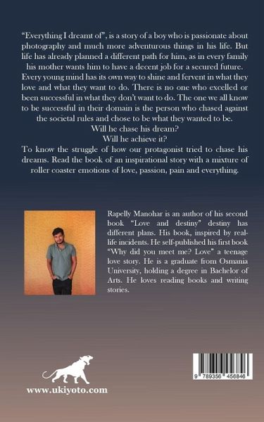 "Everything I dreamt of", is a story of a boy who is passionate about photography and much more adventurous things in his life. But life has already planned a different path for him, as in every family his mother wants him to have a decent job for a secured future. Every young mind has its own way to shine and fervent in what they love and what they want to do. There is no one who excelled or been successful in what they don't want to do. The one we all know to be successful in their domain is the person who chased against the societal rules and chose to be what they wanted to be. Will he chase his dream? Will he achieve it? To know the struggle of how our protagonist tried to chase his dreams. Read the book of an inspirational story with a mixture of roller coaster emotions of love, passion, pain and everything.