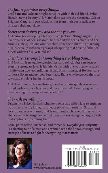 The future promises everything... until Sam and Jackson Knight conspire with their old friend, Price Hardin, now a Deputy U.S. Marshal, to capture the notorious Colson Brigham Gang, and two relationships from their pasts surface to threaten their marriage. Secrets can destroy you and the one you love... And Sam's been keeping a big one from Jackson. Struggling with an irrational fear of being stalked, her inability to bear a child, and her amnesia, she questions whether she's done the right thing marrying him, especially with town gossips whispering that he's the father of a local widow's five-year-old son. Their love is strong, but something is troubling Sam... And Jackson fears outlaws, jealousies, and self-doubts can destroy even the strongest love. Is his friendship with the woman who saved his life years ago jeopardizing his and Sam's marriage? He does care for Jessa Nolan and her boy, Peter Jack. That's why he moved them to town and employs her in his hotel. And then there is Deacon Storey, the charismatic gambler who was raised with Sam as a brother and once dreamed of marrying her. Is he expecting to take up where he left off? They risk everything... Drawn into Price Hardin's scheme to set a trap with a lure so enticing no outlaw craving fame, fortune, or power can resist it, Sam and Jackson must trust family and friends and each other if they've any chance of protecting the town citizens and surviving the tangled web of deceptions threatening them. Equal parts action, suspense, and romance, Everything in Prosperity is a riveting tale of a man and a woman with the honor, courage, and strength of heart to fight for everything that matters.