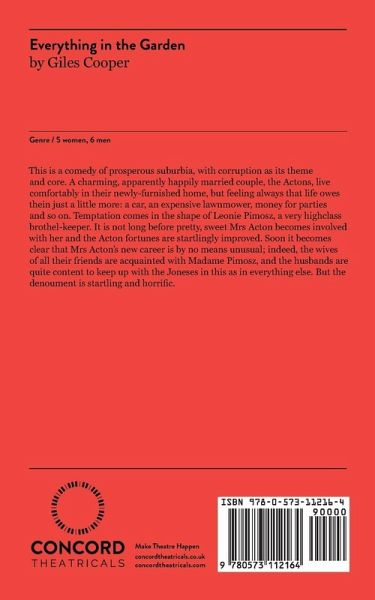This is a comedy of prosperous suburbia, with corruption as its theme and core. A charming, apparently happily married couple, the Actons, live comfortably in their newly-furnished home, but feeling always that life owes thein just a little more: a car, an expensive lawnmower, money for parties and so on. Temptation comes in the shape of Leonie Pimosz, a very high class brothel-keeper. It is not long before pretty, sweet Mrs Acton becomes involved with her and the Acton fortunes are startlingly improved. Soon it becomes clear that Mrs Acton's new career is by no means unusual; indeed, the wives of all their friends are acquainted with Madame Pimosz, and the husbands are quite content to keep up with the Joneses in this as in everything else. But the denoument is startling and horrific.