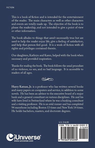 This is a book of fiction and is intended for the entertainment of the reader. The main characters as well as other characters and events are totally made up. The objective of the book is to please the readership, and not intended to give a point of view or other information. The book alludes to things that aren't necessarily true but are used to help the reader enjoy life, give a feeling of satisfaction, and help that person feel good. It is a work of fiction with all rights and privileges contained therein. Our daughters, Kathryn and Karen, helped with the book when necessary and provided inspiration. Thanks for reading the book. The book follows the usual procedure of no violence, no sex, and no bad language. It is accessible to readers of all ages.