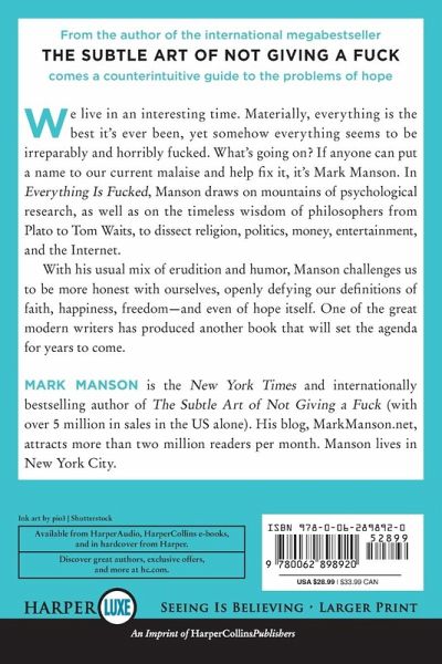 From the author of the international megabestseller The Subtle Art of Not Giving a Fuck comes a counterintuitive guide to the problems of hope We live in an interesting time. Materially, everything is the best it’s ever been, yet somehow everything seems to be irreparably and horribly fucked. What’s going on? If anyone can put a name to our current malaise and help fix it, it’s Mark Manson. In Everything Is Fucked, Manson draws on mountains of psychological research, as well as on the timeless wisdom of philosophers from Plato to Tom Waits, to dissect religion, politics, money, entertainment, and the Internet. With his usual mix of erudition and humor, Manson challenges us to be more honest with ourselves, openly defying our definitions of faith, happiness, freedom—and even of hope itself. One of the great modern writers has produced another book that will set the agenda for years to come.
