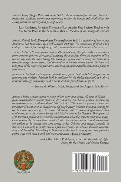 "Everything is Returned to the Soil is a bilingual, full-length poetry collection of poems on the spiritual, political, and cultural realms. Reading Briana Muñoz's poetry is like following her as she reclaims her Indigenous culture, recounts moments growing up wedged in-between two borders, all while breaking long existing patriarchal structures within her existence as a woman of color."