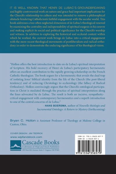 It is well known that Henri de Lubac's groundbreaking and highly controversial work on nature and grace had important implications for the Church's relationship to culture and was intended to remove a philosophical obstacle hindering Catholicism's faithful engagement with the secular world. This book addresses a too-often neglected dimension of de Lubac's theological renewal by examining the centrality and indispensability of spiritual exegesis in his oeuvre and making explicit its social and political significance for the Church's worship and witness. In addition to exploring the historical and ecclesial context within which he worked, the current work brings de Lubac into a critical engagement with the more recent theological movements of postliberalism and radical orthodoxy in order to demonstrate the enduring significance of his theological vision.