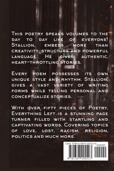 This is an anthology of collective writing from Marc Stallion written during 2017. Everything Left is a reflection of the social collapses in the 21st century alongside day to day struggles and fortunes, social programming, faith and the lack of true listening within society. How often do you check-in with friends and family? We see each other smile, we hear each other laugh, but we ignore each other's cries. This collection is for everyone and everything unheard. Each piece represents Everything Left within us, and everything left unsaid.