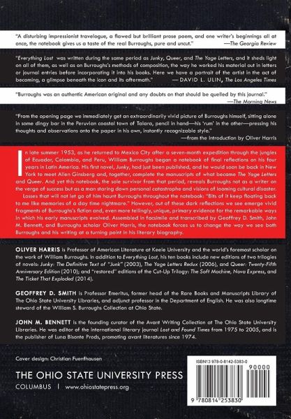 In late summer 1953, as he returned to Mexico City after a seven-month expedition through the jungles of Ecuador, Colombia, and Peru, William Burroughs began a notebook of final reflections on his four years in Latin America. His first novel, Junkie, had just been published and he would soon be back in New York to meet Allen Ginsberg and together complete the manuscripts of what became The Yage Letters and Queer. Yet this notebook, the sole survivor from that period, reveals Burroughs not as a writer on the verge of success, but as a man staring down personal catastrophe and visions of looming cultural disaster. Losses that will not let go of him haunt Burroughs throughout the notebook: "Bits of it keep floating back to me like memories of a daytime nightmare." However, out of these dark reflections we see emerge vivid fragments of Burroughs' fiction and, even more tellingly, unique, primary evidence for the remarkable ways in which his early manuscripts evolved. Assembled in facsimile and transcribed by Geoffrey D. Smith, John M. Bennett, and Burroughs scholar Oliver Harris, the notebook forces us to change the way we see both Burroughs and his writing at a turning point in his literary biography.