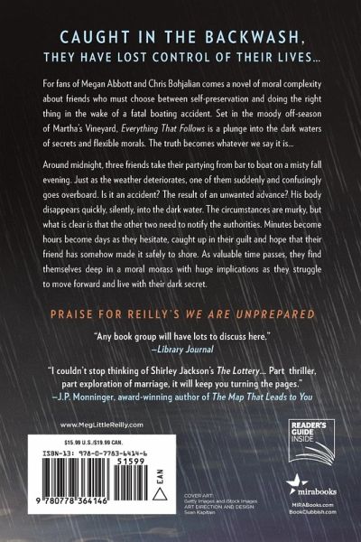 CAUGHT IN THE BACKWASH, THEY HAVE LOST CONTROL OF THEIR LIVES... For fans of Megan Abbott and Chris Bohjalian comes a novel of moral complexity about friends who must choose between self-preservation and doing the right thing in the wake of a fatal boating accident. Set in the moody off-season of Martha's Vineyard, Everything That Follows is a plunge into the dark waters of secrets and flexible morals. The truth becomes whatever we say it is... Around midnight, three friends take their partying from bar to boat on a misty fall evening. Just as the weather deteriorates, one of them suddenly and confusingly goes overboard. Is it an accident? The result of an unwanted advance? His body disappears quickly, silently, into the dark water. The circumstances are murky, but what is clear is that the other two need to notify the authorities. Minutes become hours become days as they hesitate, caught up in their guilt and hope that their friend has somehow made it safely to shore. As valuable time passes, they find themselves deep in a moral morass with huge implications as they struggle to move forward and live with their dark secret.