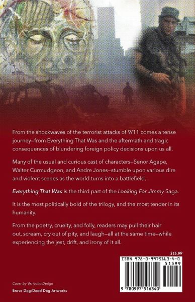 From the shockwaves of the terrorist attacks of 9/11 comes a tense journey-from Everything That Was and the aftermath and tragic consequences of blundering foreign policy decisions upon us all. Many of the usual and curious cast of characters-Senor Agape, Walter Curmudgeon, and Andre Jones-stumble upon various dire and violent scenes as the world turns into a battlefield. Everything That Was is the third part of the Looking For Jimmy Saga. It is the most politically bold of the trilogy, and the most tender in its humanity. From the poetry, cruelty, and folly, readers may pull their hair out, scream, cry out of pity, and laugh-all at the same time-while experiencing the jest, drift, and irony of it all.
