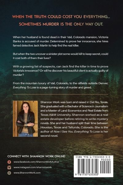When the truth could cost you everything...sometimes murder is the only way out. When her husband is found dead in their Vail, Colorado mansion, Victoria Banks is accused of murder. Determined to prove her innocence, she hires famed detective Jack Martin to help find the real killer. But when the two uncover a sinister plot some would kill to keep secret, could it cost both of them their lives? With a growing list of suspects, can Jack find the killer in time to prove Victoria's innocence? Or will he discover his beautiful client is actually guilty of murder? From the mountain luxury of Vail, Colorado, to the oilfields outside Denver, Everything To Lose is a page-turning story of murder and greed.