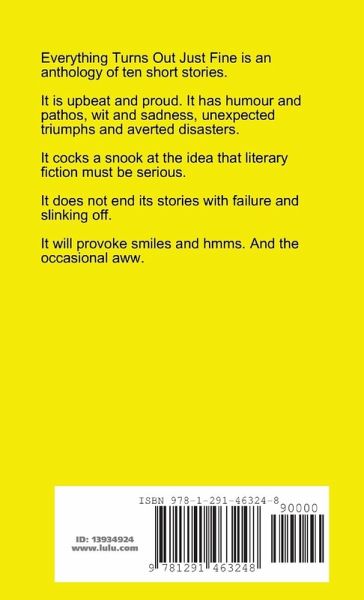 Everything Turns Out Just Fine is an anthology of ten short stories. It is upbeat and proud. It has humour and pathos, wit and sadness, unexpected triumphs and averted disasters. It cocks a snook at the idea that literary fiction must be serious. It does not end its stories with failure and slinking off. It will provoke smiles and hmms. And the occasional aww.