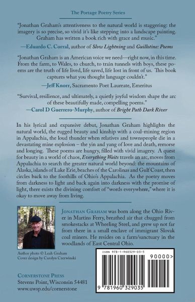 In his lyrical and expansive debut, Jonathan Graham highlights the natural world, the rugged beauty and kinship with a coal-mining region in Appalachia, the loud thunder when relatives and townspeople die in a devastating mine explosion - the yin and yang of love and death, remorse and longing. These poems are hungry, filled with vivid imagery. A quest for beauty in a world of chaos, Everything Waits travels an arc, moves from Appalachia to search the greater natural world beyond: the mountains of Alaska, islands of Lake Erie, beaches of the Carolinas and Gulf Coast, then circles back to the foothills of Ohio's Appalachia. As the poetry moves from darkness to light and back again into darkness with the promise of light, there exists the divining comfort of "words everywhere," where it is okay to move away from living.
