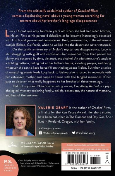 From the critically acclaimed author of Crooked River comes a fascinating novel about a young woman searching for answers about her brother’s long-ago disappearance Lucy Durant was only fourteen years old when she lost her older brother, Nolan. First to his paranoid delusions as he became increasingly obsessed with UFOs and government conspiracies. Then, permanently, to the wilderness outside Bishop, California, when he walked into the desert and never returned. On the tenth anniversary of Nolan’s mysterious disappearance, Lucy is still struggling with guilt and confusion—her memories from that period are blurry and obscured by time, distance, and alcohol. An adult now, she’s stuck in a holding pattern, hiding out at her father’s house, avoiding people, and doing whatever she can to keep herself from thinking about Nolan. But when a series of unsettling events leads Lucy back to Bishop, she is forced to reconcile with her estranged mother and come to terms with the tangled memories of her past to discover what really happened to her brother all those years ago. Told in Lucy’s and Nolan’s alternating voices, Everything We Lost is a psychological mystery exploring family, beliefs, obsessions, the nature of memory, and fear of the unknown.