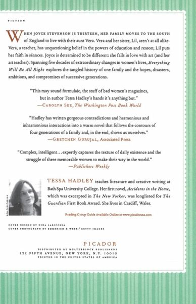 When Joyce Stevenson is thirteen, her family moves to the south of England to live with their aunt Vera. Vera and her sister Lil aren't at all alike. Vera, a teacher, has unquestioning belief in the powers of education and reason; Lil puts her faith in seances. Joyce is determined to be different: she falls in love with art (and her art teacher). Spanning five decades of extraordinary change in women's lives, Tessa Hadley's Everything Will Be All Right explores the tangled history of one family and the disasters, hopes, compromises, and ambitions of successive generations.