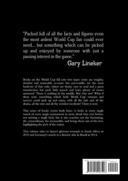 Books on the World Cup fall into two types: some are weighty, detailed and reasonably accurate but inaccessible, for the most hardcore of fans only; others are funny, easy to read and a great introduction but pack little punch and leave plenty of stones unturned. There is nothing in the middle. But why not? What if there were something which both World Cup veterans and novices could pick up and enjoy, with all the info and all the drama, all the stats and all the weirdest incidents? There is now. This series of books looks at every single match in more detail than ever before but it also searches out the fascinating, the extraordinary, the memorable, and brings them out of the text, highlighting the pick of the action. This volume takes in Spain's glorious triumph in South Africa in 2010 and Germany's march to a historic title in 2014.