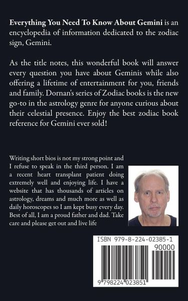 Everything You Need To Know About Gemini is an encyclopedia of information dedicated to the zodiac sign, Gemini. As the title notes, this wonderful book will answer every question you have about Geminis while also offering a lifetime of entertainment for you, friends and family. Do not waste your money on expensive alternatives with half the content, claiming expertise. Dornan's series of Zodiac books is the new go-to in the astrology genre for anyone curious about their celestial presence. You simply have to read the Table of Contents to realize that other books on this subject are subpar at best. Enjoy the best zodiac book reference for Gemini ever sold!