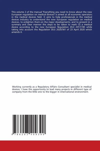 This volume 2 of the manual "Everything you need to know about the new European regulation on medical devices" is aimed at all economic operators in the medical devices field. It aims to help professionals in the medical devices industry to understand the new European regulation on medical devices, to enlighten them on the major developments, and to present in a summary and clear manner the steps to be taken to mark CE a medical device according to the new European Regulation (EU) 2017/745 while taking into account the Regulation (EU) 2020/561 of 23 April 2020 which amends it.