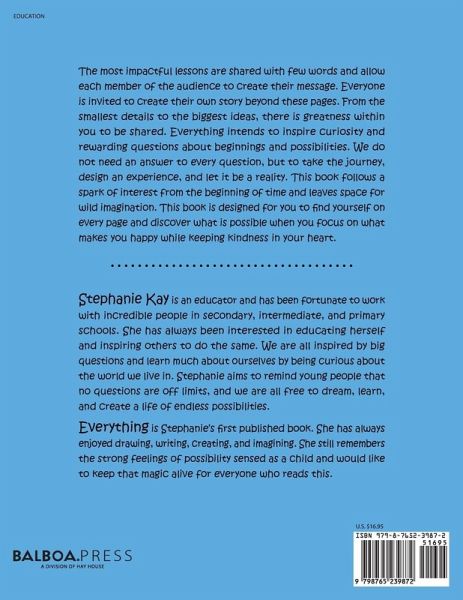 The most impactful lessons are shared with few words and allow each member of the audience to create their message. Everyone is invited to create their own story beyond these pages. From the smallest details to the biggest ideas, there is greatness within you to be shared. Everything intends to inspire curiosity and rewarding questions about beginnings and possibilities. We do not need an answer to every question, but to take the journey, design an experience, and let it be a reality. This book follows a spark of interest from the beginning of time and leaves space for wild imagination. This book is designed for you to find yourself on every page and discover what is possible when you focus on what makes you happy while keeping kindness in your heart.