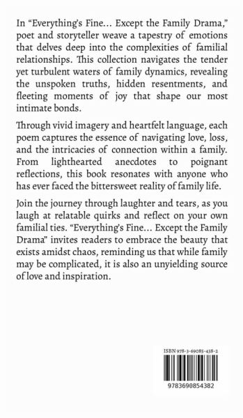 In "Everything's Fine... Except the Family Drama," poet and storyteller weave a tapestry of emotions that delves deep into the complexities of familial relationships. This collection navigates the tender yet turbulent waters of family dynamics, revealing the unspoken truths, hidden resentments, and fleeting moments of joy that shape our most intimate bonds. Through vivid imagery and heartfelt language, each poem captures the essence of navigating love, loss, and the intricacies of connection within a family. From lighthearted anecdotes to poignant reflections, this book resonates with anyone who has ever faced the bittersweet reality of family life. Join the journey through laughter and tears, as you laugh at relatable quirks and reflect on your own familial ties. "Everything's Fine... Except the Family Drama" invites readers to embrace the beauty that exists amidst chaos, reminding us that while family may be complicated, it is also an unyielding source of love and inspiration.