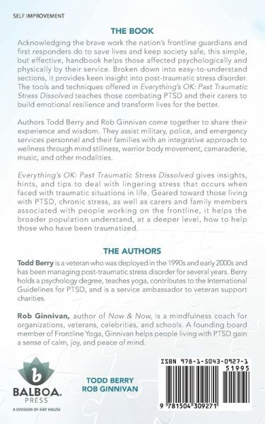 Acknowledging the brave work the nation’s frontline guardians and first responders do to save lives and keep society safe, this simple, but effective, handbook helps those affected psychologically and physically by their service. Broken down into easy-to-understand sections, it provides keen insight into post-traumatic stress disorder. The tools and techniques offered in Everything’s OK: Past Traumatic Stress Dissolved teaches those combating PTSD and their carers to build emotional resilience and transform lives for the better. Authors Todd Berry and Rob Ginnivan come together to share their experience and wisdom. They assist military, police, and emergency services personnel and their families with an integrative approach to wellness through mind stillness, warrior body movement, camaraderie, music, and other modalities. Everything’s OK: Past Traumatic Stress Dissolved gives insights, hints, and tips to deal with lingering stress that occurs when faced with traumatic situations in life. Geared toward those living with PTSD, chronic stress, as well as carers and family members associated with people working on the frontline, it helps the broader population understand, at a deeper level, how to help those who have been traumatized.